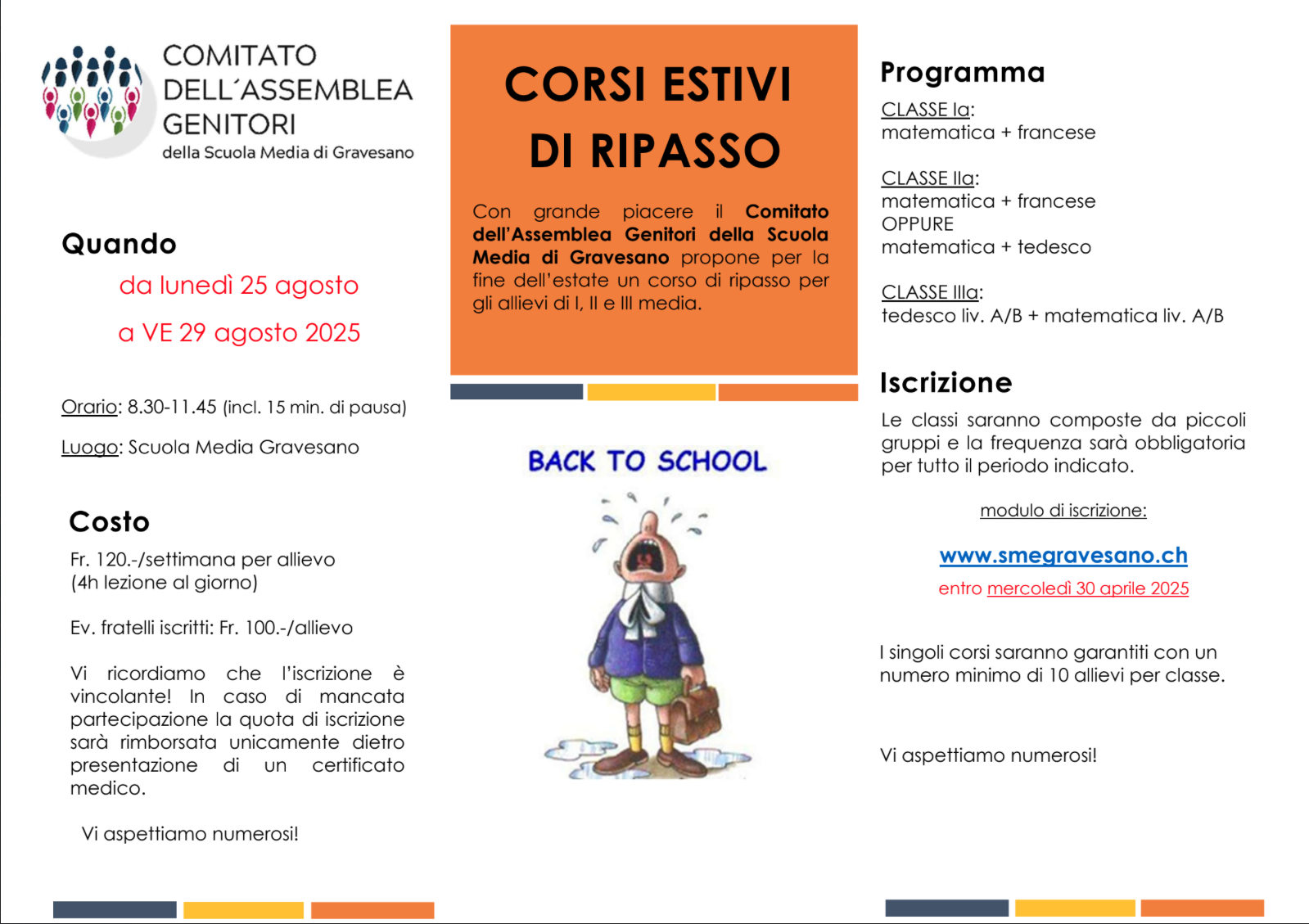 Scuola Media di Gravesano Via Istituto Rusca, GravesanoCon grande piacere il Comitato dell’Assemblea Genitori della Scuola Media di Gravesano propone per la fine dell’estate un corso di ripasso per gli allievi di I, II e III media. Costo Fr. 120.-/settimana per allievo (4h lezione al giorno) Eventuali fratelli iscritti: Fr. 100.-/allievo Vi ricordiamo che l’iscrizione è vincolante! In caso di mancata partecipazione […]